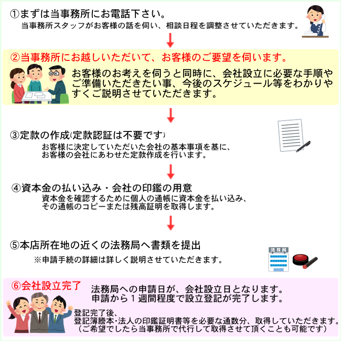創業支援特別コース定款認証手数料 不要 不要 定款認証の収入印紙代 40,000円 0円 登記登録免許税 60,000円 60,000円 登記簿謄本・印鑑証明書代 実費 実費 専門家手数料 0円 0円 交通費・郵便代等 実費 実費 時間と手間 測定不能 0円 総額 100,000円 60,000円 - ※専門家手数料:事務処理の関係で一旦手数料を頂き初回税理士報酬から同額を差し引くので実質0円です。